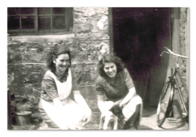 Ena Davis and ? McTiernan in yard at Gillmor’s Shop circa 1947.