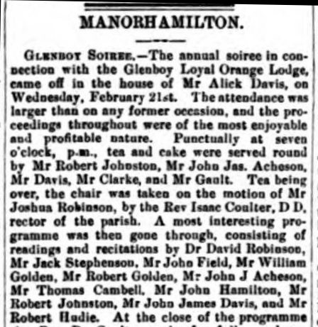 Alick (Alexander) Davis farmed at Glenboy and in 1890 he was Worshipful Master (Chairman) of the local Glenboy Orange branch. His wife, Sarah’s family, the Mealys (O’Malley) were similarly active in the nearby Tullyskearney lodge. In 1894 the annual Soiree of the Glenboy Lodge was held in Alick’s house and a report of the meeting outlines the tea and cakes, recitations, and opposition to Home Rule. The Parish clergyman Rev Isaac Coulter present at Alick’s house that evening counselled restraint saying that they disapproved to a break with England and not with our Catholic neighbours or their religion, a message he repeated elsewhere.