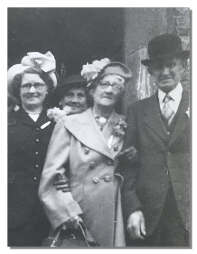 Hugh and Lizzie were at my parents’ wedding in Manorhamilton Parish Church and after in Sligo Town in 1950. In an informal wedding picture outside the church they look frail and slightly out of place. Hugh died a few years later in 1954. His coffin was appropriately placed in a carriage drawn by two black horses. In his honour the Galgorm Parks Orange Lodge with its Lambeg drums and band would, for some years, stop in respect outside his Princess Street home, on their way to the annual 12th of July celebrations. My Grandmother, Lizzie died in February 1961 and they are buried together in Ballymena Cemetery.