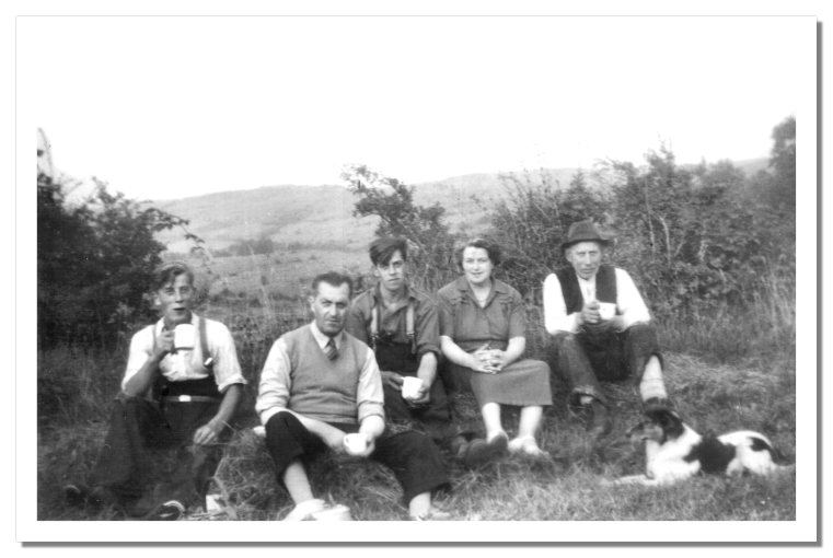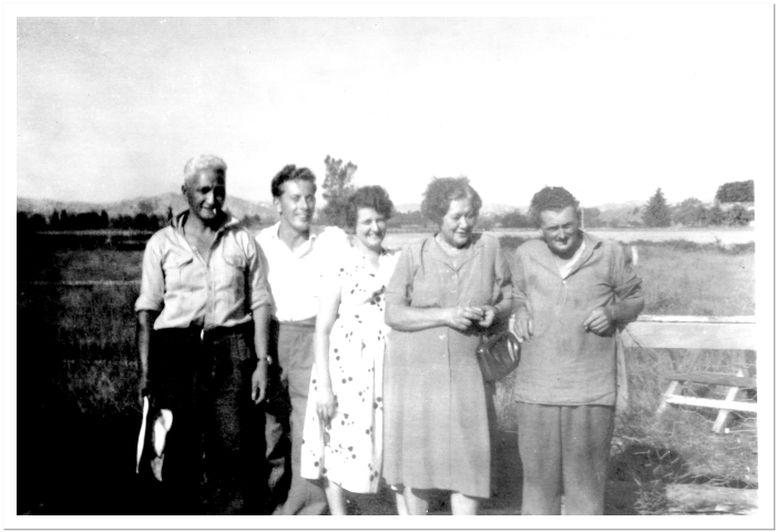 At a break from saving hay, from left, Jack, His Uncle Alex (Gillmor), brother Cecil, Aunt Hilda and his father Richard, circa 1949.