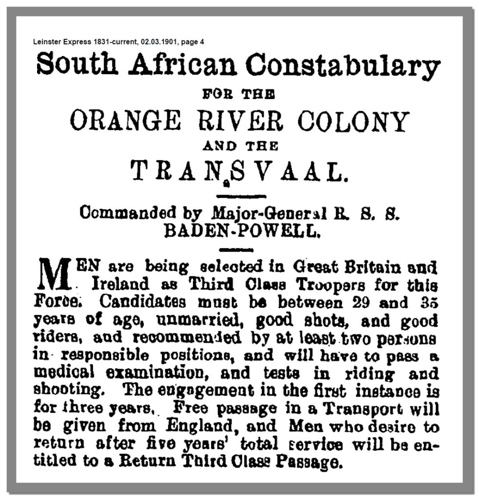 After his bothers Robert and James joined the army William spent the next fifteen years living and working on the farm at Boggaun with his father, James, his remaining brothers Alex and Richard and his sister, Mary Jane. What prompted him to leave after this time? There had been adverts in the local newspapers recruiting for the South African Constabulary (SAC) with the promise of assisted settlement for those who wished to stay after their term was over. Recruitment to Irish-based regiments had stopped at the time due to fears of rebellion in Ireland; a concern that the Irish would take an example from the defiant Boers. Given that there had been a number of difficult years with low farm incomes, coupled with the family’s unease at the Nationalist campaign for change and the growing clamour for Home Rule, perhaps William was drawn by the opportunity of a life elsewhere; as had many others before him from the Boggaun farm.