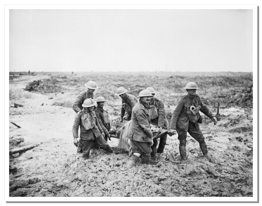 Stretcher bearers in the mud with an injured soldier at Pilcken Ridge, Ypres, Belguim, September 1917.