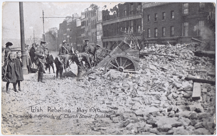 This final post card depicts the aftermath of the Easter Rising or referred to as the ‘Irish Rebellion May 1916. The wreck they made of Church Street, Dublin.’ It was written and sent by James Davis, eldest son of John and Anna Maria Davis, Corballis, Dunore, Co Meath, to his Uncle Alex who lived close by. Sometime after Margaret’s death Alex moved back to his home at Boggaun in County Leitrim and perhaps the card refers indirectly to her recent death. James emigrated to Alberta in Canada with Bertie Gillmor in the early 1920s, and settled in Daysland.
