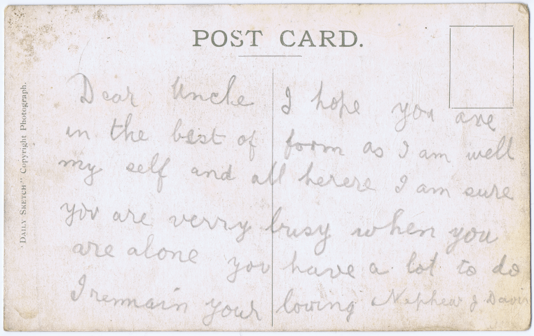 The card is signed by “W. T.”, likely to be William Taylor, and addressed to John Davis, referred to “Jas” on the card. John Davis, eldest brother of my grandfather’s generation, had moved from the Newtowngore area of south Leitrim area to Corballis, Dunore in Co Meath around 1906. William followed him and like John built a house there, marrying John’s sister-in-law Margaret Cartwright. When William died John’s brother Alex married Margaret. Living a stone’s throw apart, the Leitrim brothers had a stormy relationship which ended up in court when John sued Alex for damages caused to his prize horse.