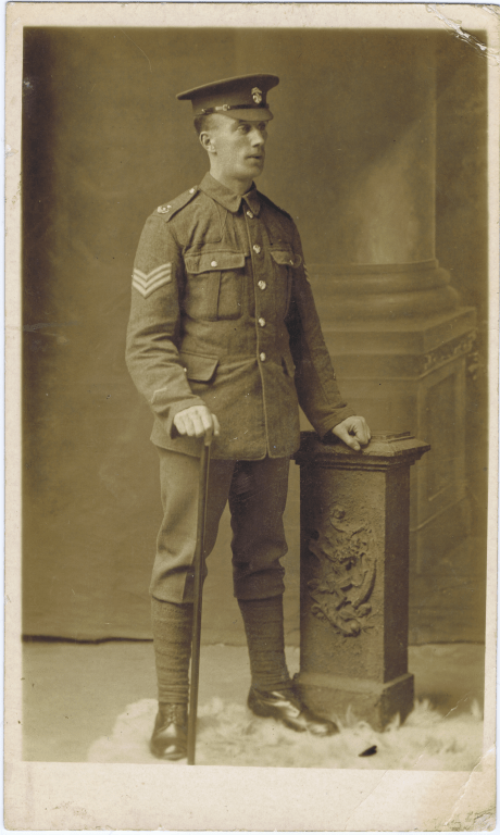 At first this striking WW1 photograph was thought to be that of Bertie Gillmor. However, following a review by volunteers at ‘the great war forum’ it appears that he was a sergeant in the Inniskilling Fusiliers. A search revealed the most likely candidate as John “Jack” Young Foster, a County Cavan relation of the wife of Alex Davis, Margaret née Cartwright. His uniform displayed badges for overseas service and marksmanship. The regiment was sent to Ebrington Barracks, Derry in 1916 after serving in Serbia, Greece and Egypt, and left again for France in December of that year. The photograph was taken by “Frank Coghlan, Carlisle Road, Londonderry”.