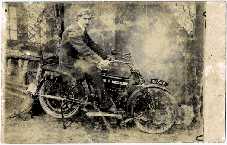 This post card was addressed to Miss Gillmour (misspelling of Gillmor), my grandmother Annie, and was probably sent by an admirer around 1910. The post mark is ‘Sligo’ but the photographer is ‘Josie Roth, The Lady Photographer’ from the Isle of Man. The motor bike has an early Isle of Man registration number.