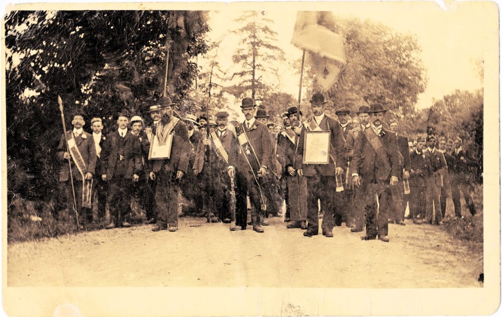 This fascinating picture postcard is of an Orange Lodge march is post marked Newtowngore, south Leitrim, 1909, a time of anti-Home Rule agitation. (Home Rule was intended to give a greater independence to Ireland within the UK but was generally not favoured by the Protestant community in Ireland.) The serious looking men with their Orange regalia are flanked by young men, some wearing pillbox hats like those of the Boy’s Brigade.