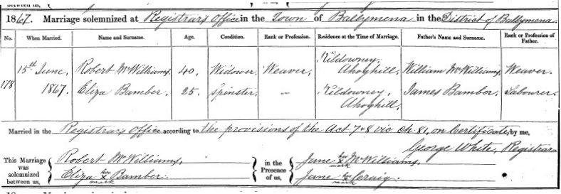Robert McWilliams, 1822 – abt. 1905. Married Elizabeth Bamber, 1842 – 1911 in 1867. Both were born in Kildowney and died in Ballymena. Robert was married twice and is described as a labourer on his marriage certificate.