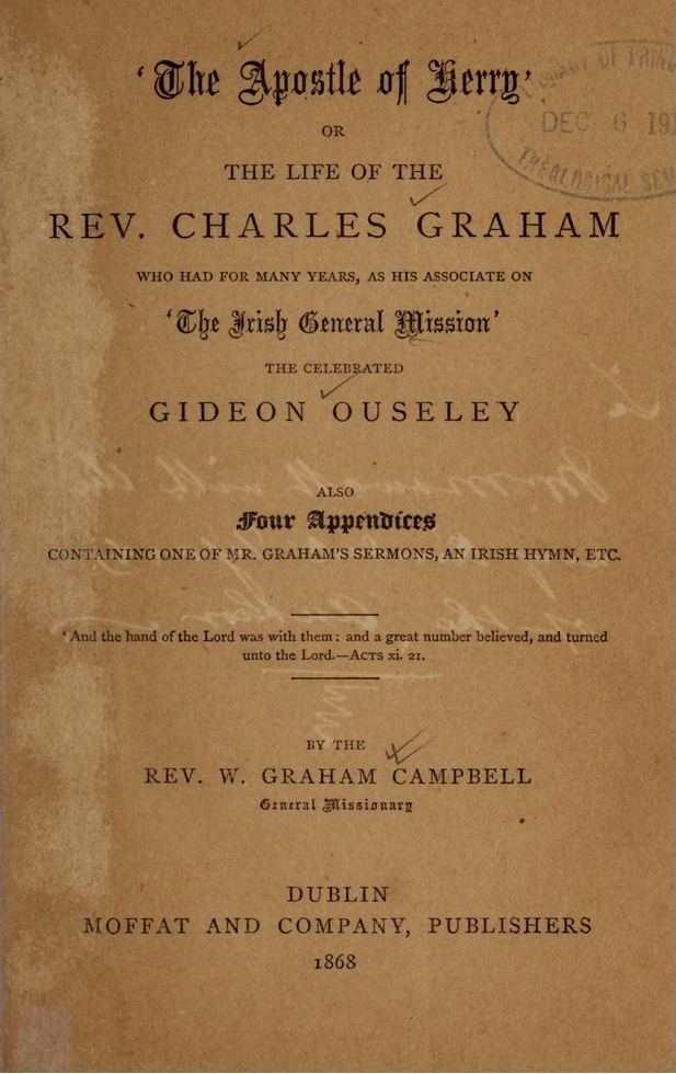This story is gleaned from ‘The Apostle of Kerry, the life of the Rev. Charles Graham’ written by his relative William Graham Campbell and published in 1868. The book is evangelical in sentiment and intention and is still available today from religious publishers. The era was one of waves of revivalist movements that swept the Protestant communities across the New and Old World from 1730 onwards. And the Methodist evangelizing in Ireland, initially led by John Wesley, was part of this phenomenon. The most notable in Ireland was the Ulster Revival in the 1850s, still a touchstone for modern-day evangelicals; it brought many converts to the Presbyterian church, particularly in east Ulster. (See previous blog, ‘The Ulster Revival’.)